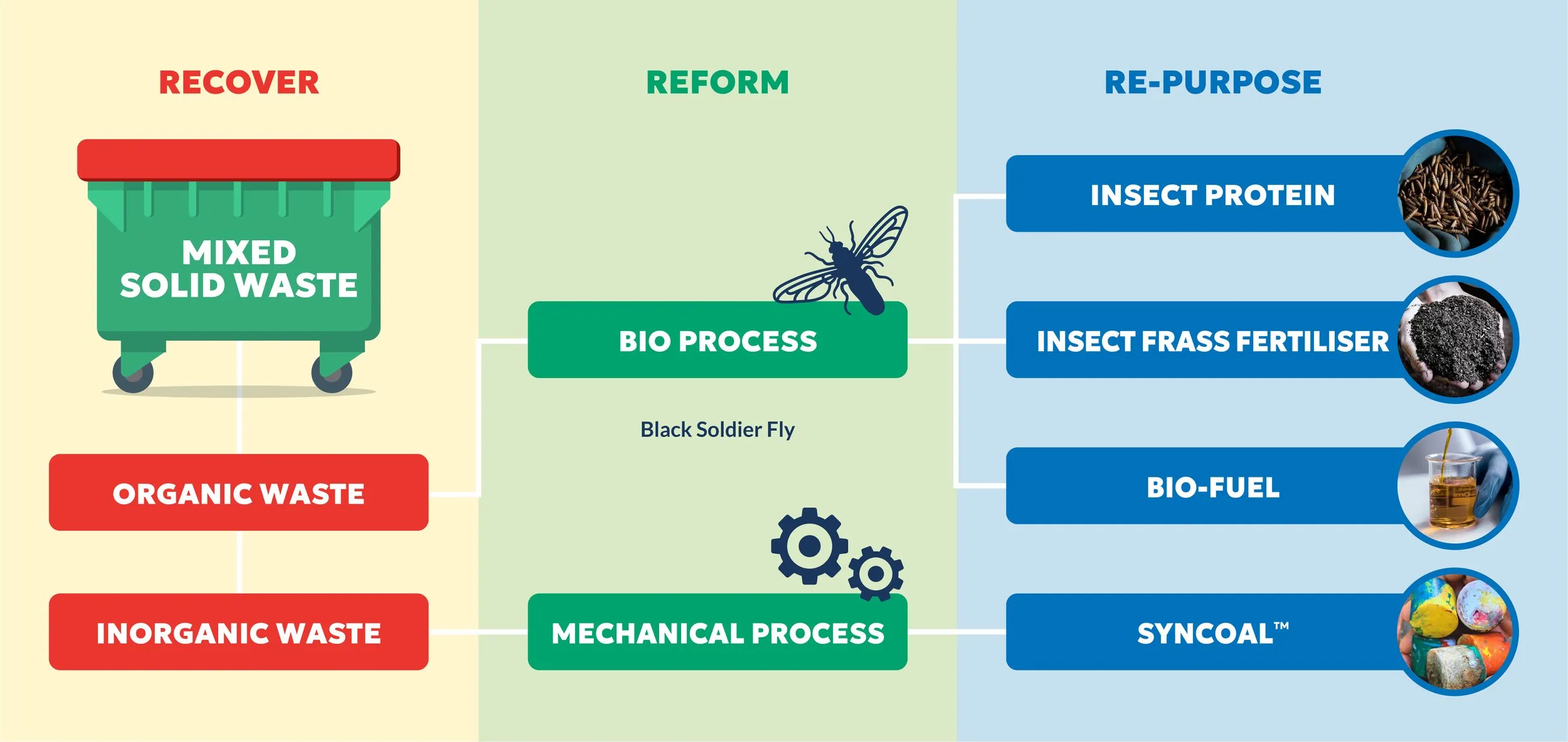 ARC-V deploys BSF biotechnology as the core of its bio-cleaning process to generating three commercial byproducts: Insect Protein, Frass Fertilizer, and Bio-Oil. No heat. No chemicals. Just biology.